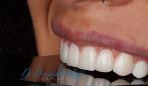 قشرة مركبة: تغطية كاملة لعدة أسنان لتصحيح الشكل وسد الفجوة.